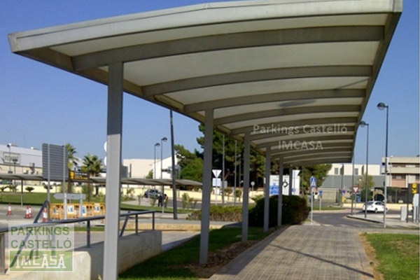Marquesina creada para el tránsito peatonal, con estructura de acero pintado con imprimación de zinc, y cubierta de policarbonato celular blanco opal.