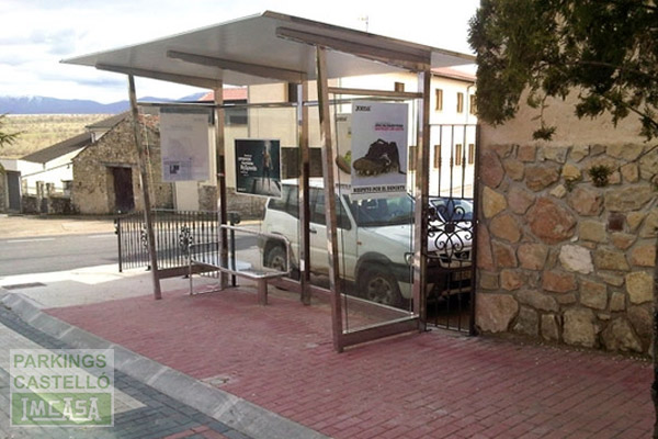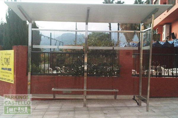 Acabados: Pilares y banco de acero inoxidable AISI 304 pulido brillante. Tejado inyectado poliuretano galvanizado y prelacado. Cristal laminado de seguridad.
