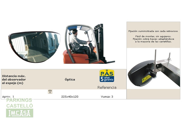 Adaptable a cualquier tipo de carretilla, este retrovisor dispone de una fijación universal (incluida) y conforme a la directiva europea 98/37 CE.